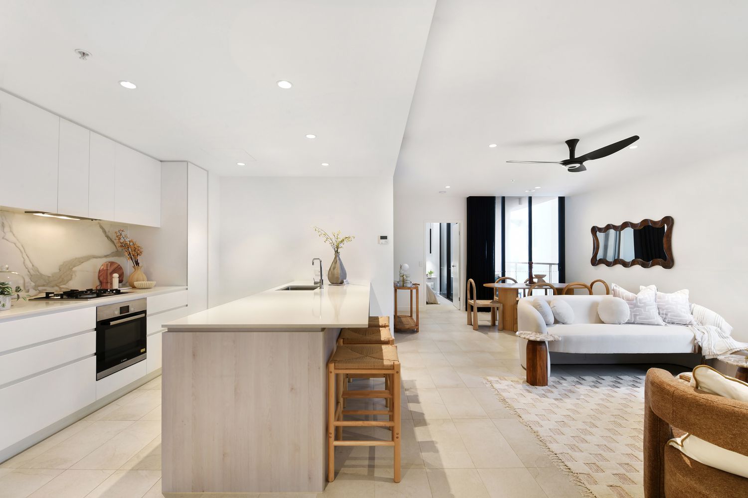 Open-Plan Design: The spacious living and dining area is bathed in natural light and flows seamlessly to a private balcony overlooking the ocean.